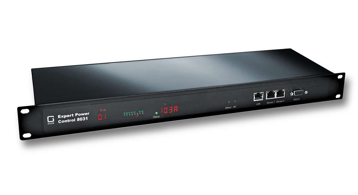 GUDE's Expert Power Control 8031 Series enables switching and metering of electrical appliances through TCP/IP network, serial interface or mobile device app. The Series consists of four versions with 8 load outlets on the rear panel:
