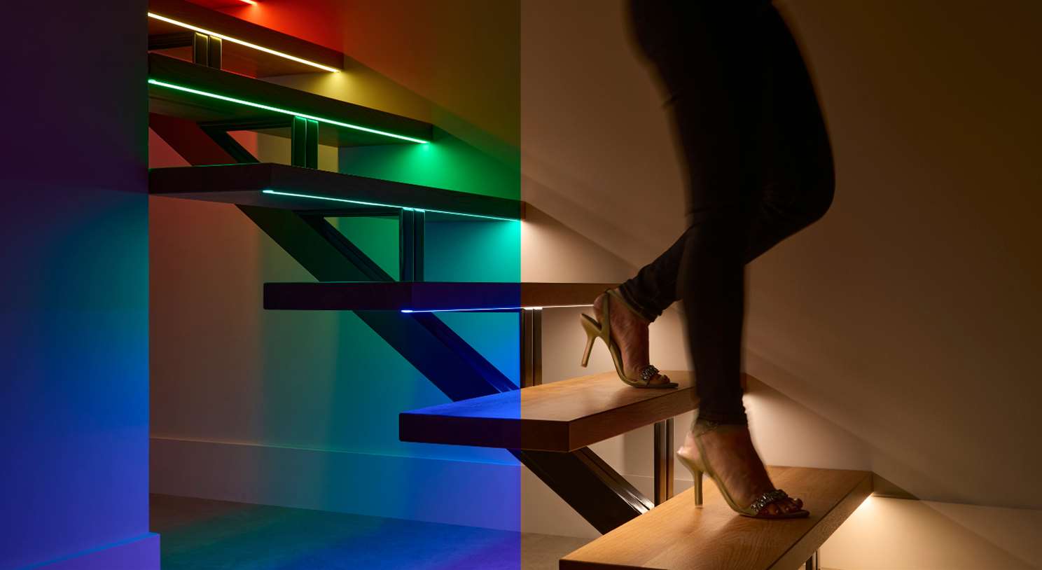 Picture this: the edges of your stairs glowing with soft, dynamic light, or the underside of your kitchen cabinets illuminated with a stunning pop of colour that highlights your room’s architectural details. The RGB capability of Lumaris means you can make your space feel playful, vibrant, and alive with colour - whether you're adding an energising splash of blue or a calming shade of pink to set the tone.